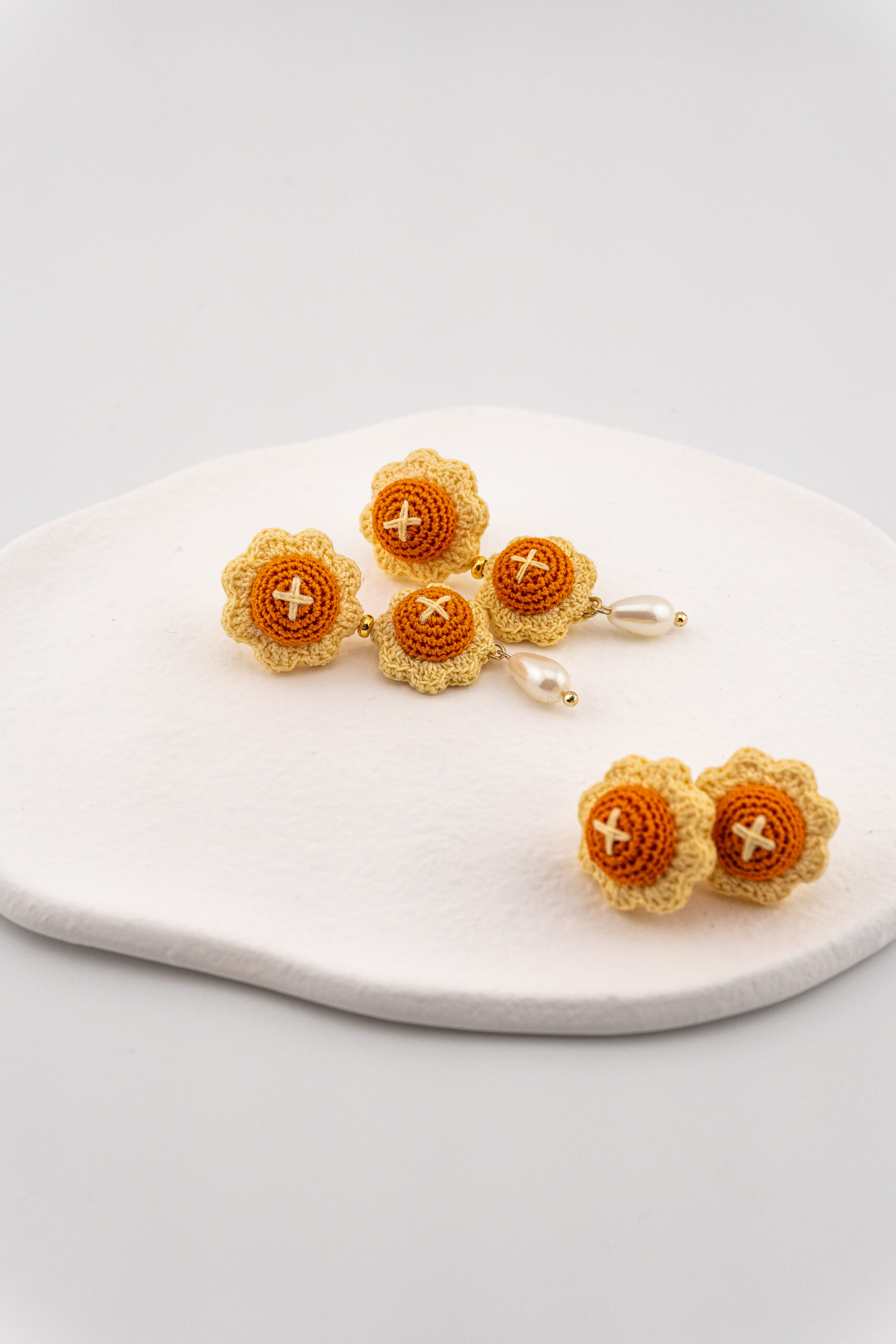 Inspired by a beloved Chinese New Year snack often associated with abundance and good fortune, this design features the hand-crocheted pineapple tart motif, finished with a delicate pearl drop for a touch of refinement.